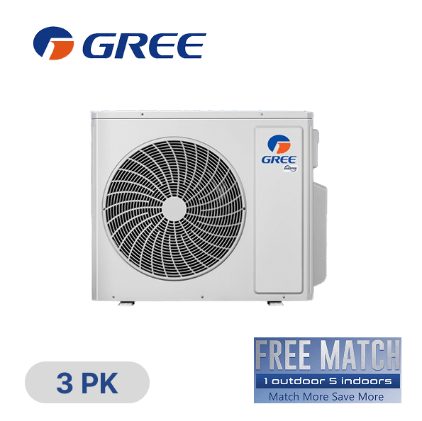 Unit outdoor GREE Free Match Inverter R32 untuk sistem multi split: hemat tempat karena 1 outdoor dapat melayani beberapa indoor (hingga 4 indoor). Fitur Fast Cooling membantu ruangan lebih cepat dingin, dengan operasi inverter yang lebih efisien dan stabil.